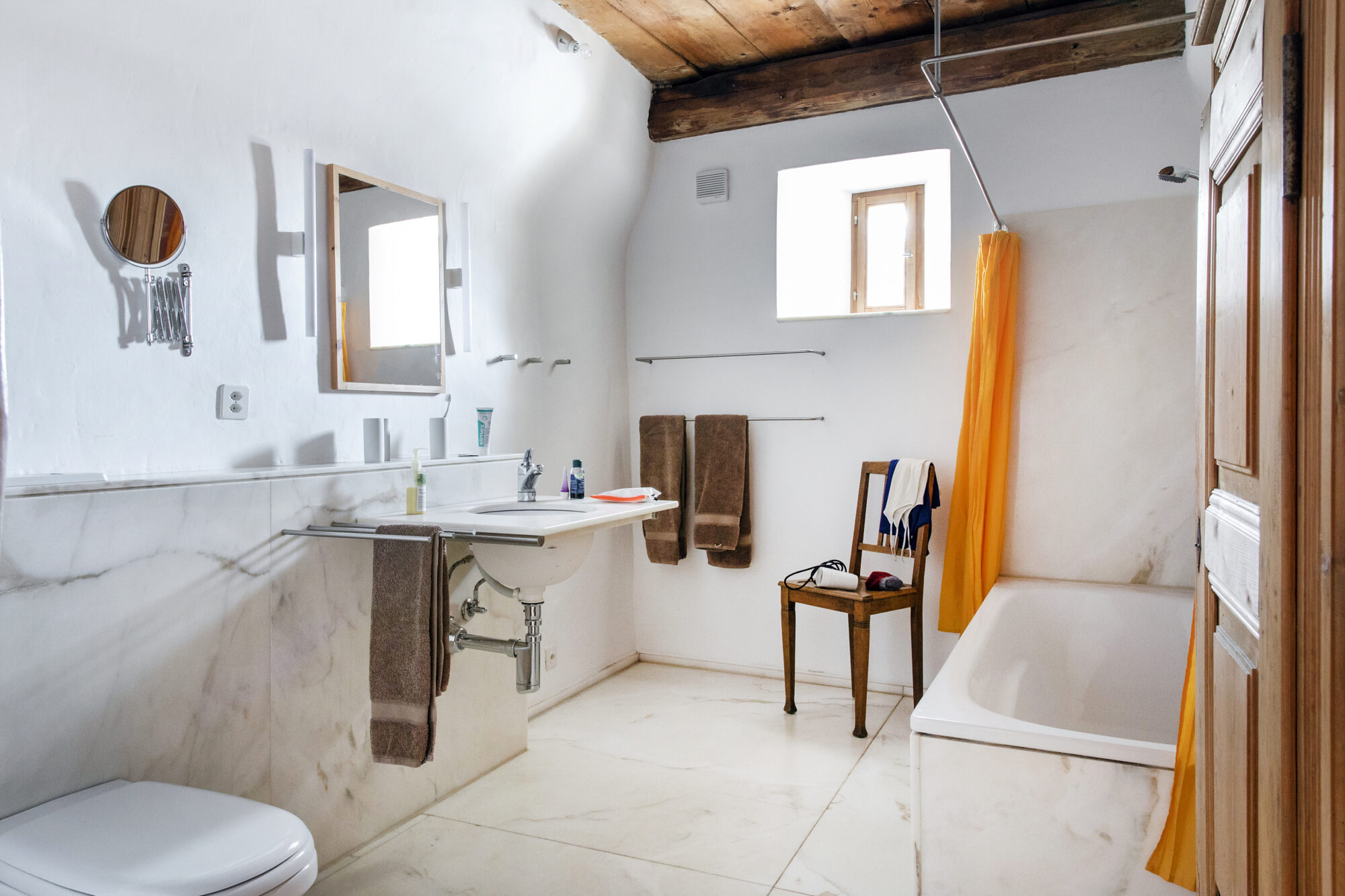 Im Haus hat es ein Badezimmer mit Duo-Badewanne/Dusche, Lavabo und Toilette. Beim Treppenpodest zwischen den beiden Geschossen befindet sich eine separate Toilette mit Lavabo. Hand- und Badetücher sowie Haartrockner sind vorhanden.