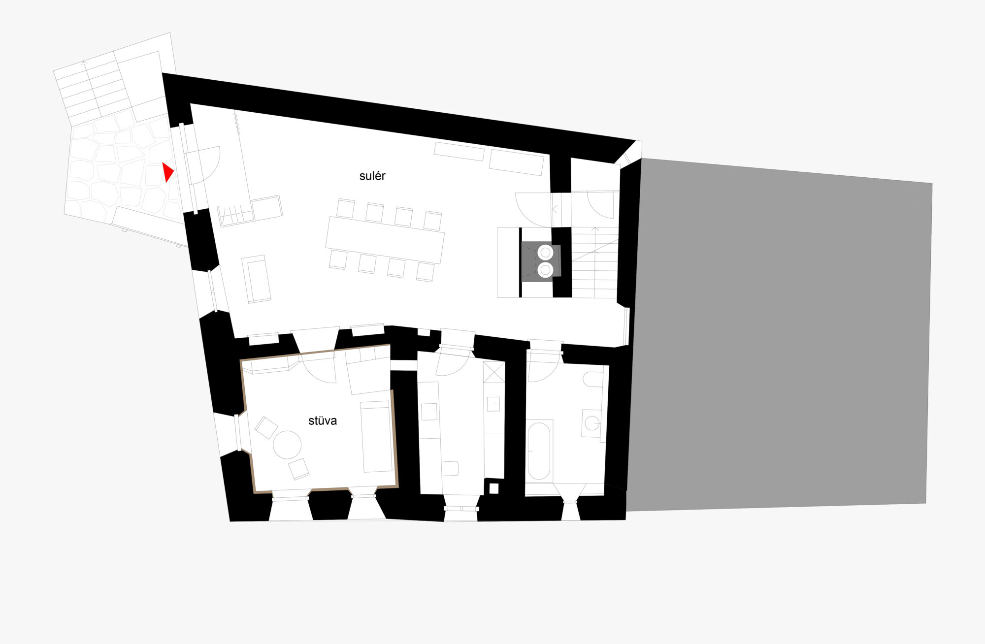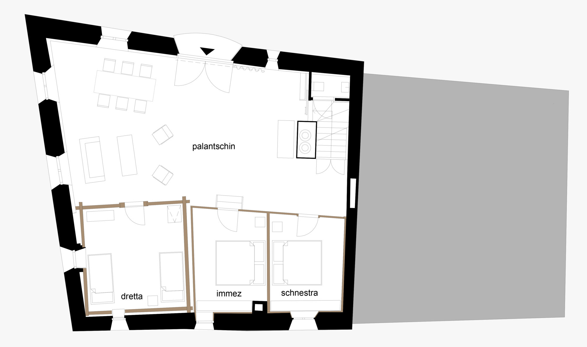 Das Erdgeschoss hat die typische Grundrisseinteilung eines Engadinerhauses: Der sulér (Korridor) beim Haupteingang als grosser Wohn- und Essraum mit einem langen Tisch und einer offenen Feuerstelle. Die holzgetäfelte und gemütliche stüva als das ursprüngliche Herz des Hauses mit dem Stubenofen und einem Tagesbett, die chadafö (Küche) im Gewölberaum und ein Badezimmer in der ehemaligen chaminada (Speisekammer).